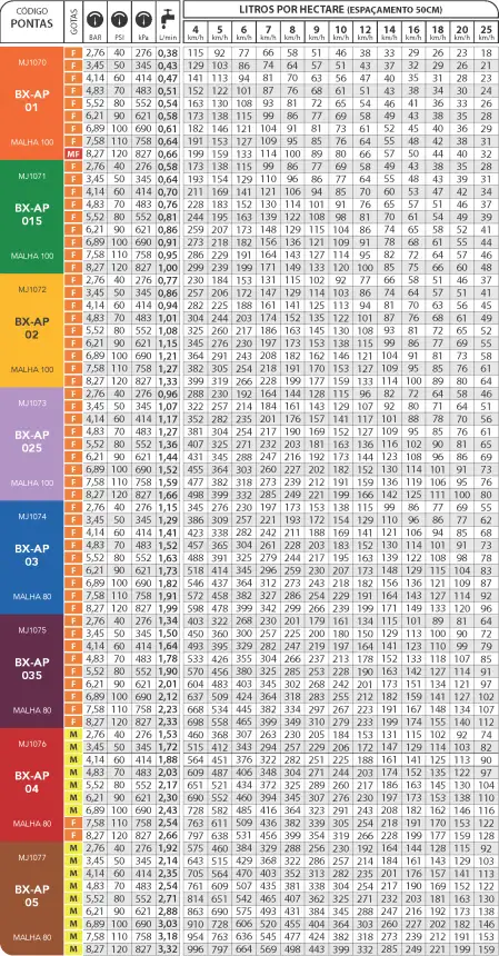 Em pulverizadores de barras, recomenda-se a série BX-AP 90° para espaçamentos entre porta-bicos de 50 cm