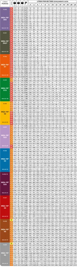 Em pulverizadores de barras, recomenda-se a série MGA 90° para espaçamentos entre porta-bicos de 50 cm;