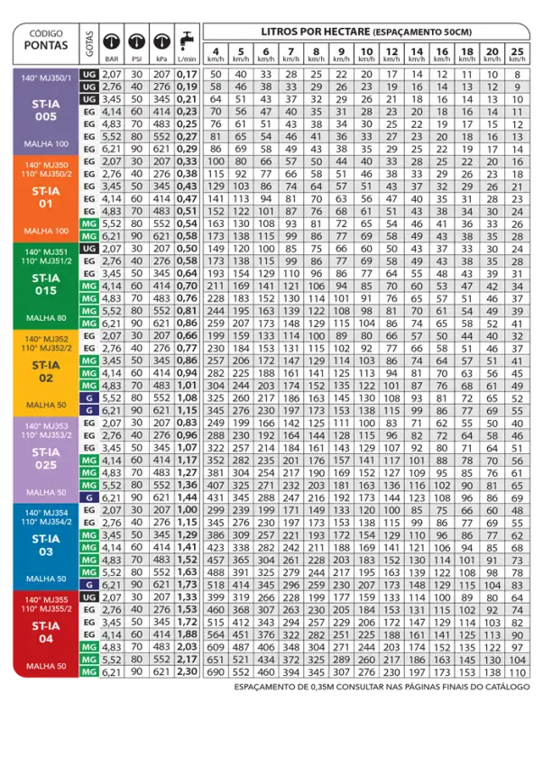 O ângulo de abertura de 140° (O maior da categoria), favorece trabalhos com altura mínima das barras de pulverização a 35 cm do alvo; (*Para espaçamento de 50 cm entre porta-bicos);